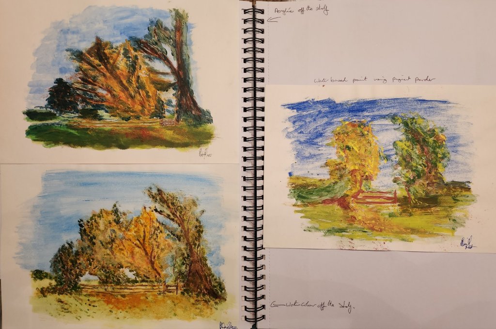 I still have three sketches on the same paper in three different mediums. Acrylics, watercolours and my own waterbased paint from pigment powders. I loved making my paints and placing them down on the paper, I found it easy to mix and blend. I also put two different powders together and mixed on my glass palette to achieve the colour or tone I wanted.