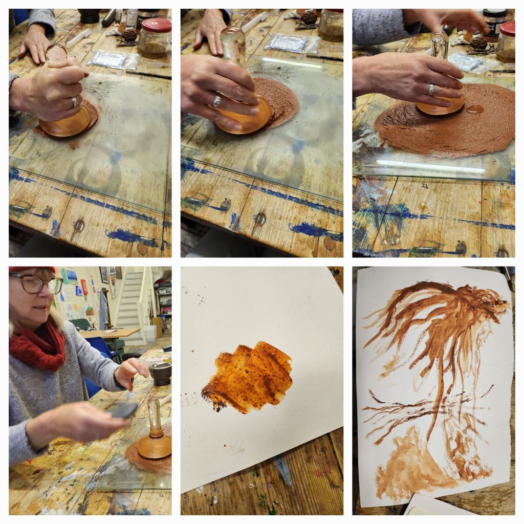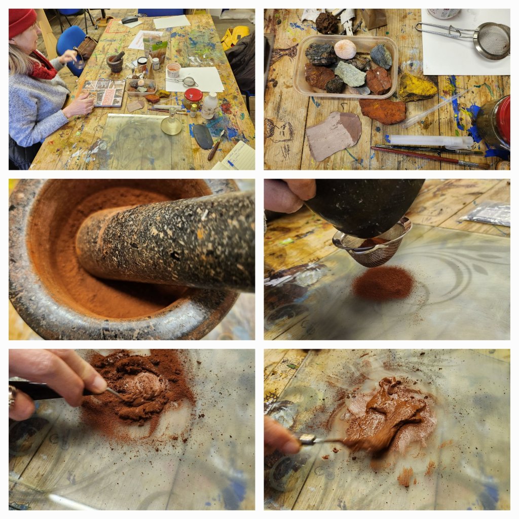 Susannah explained the process from finding the stone or soil, to grinding to a fine powder and mullering the pigment powder with a binder like gum arabic for water based paint, and finally the paste, which you can store if water based in a jar.