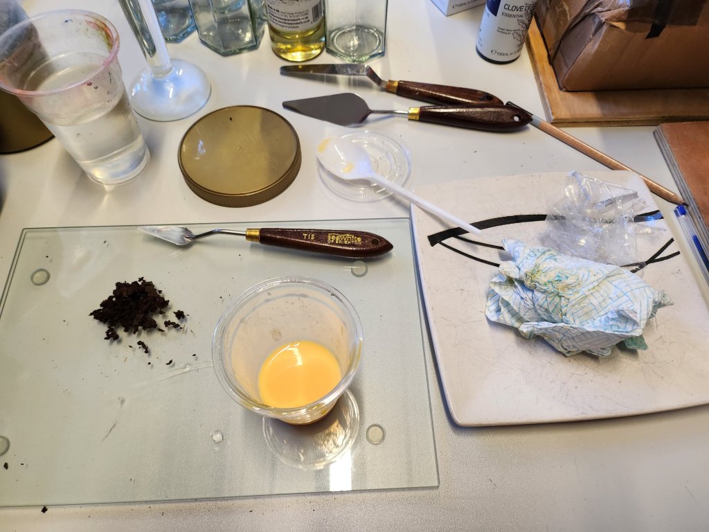After talking with my tutor, there were some pigment powders that had been given to the department and I was allowed to use them to start making my own paints. This resolved the problem of relying on postage, or the fact that I didn’t have time to take the dogs on long foraging walks.