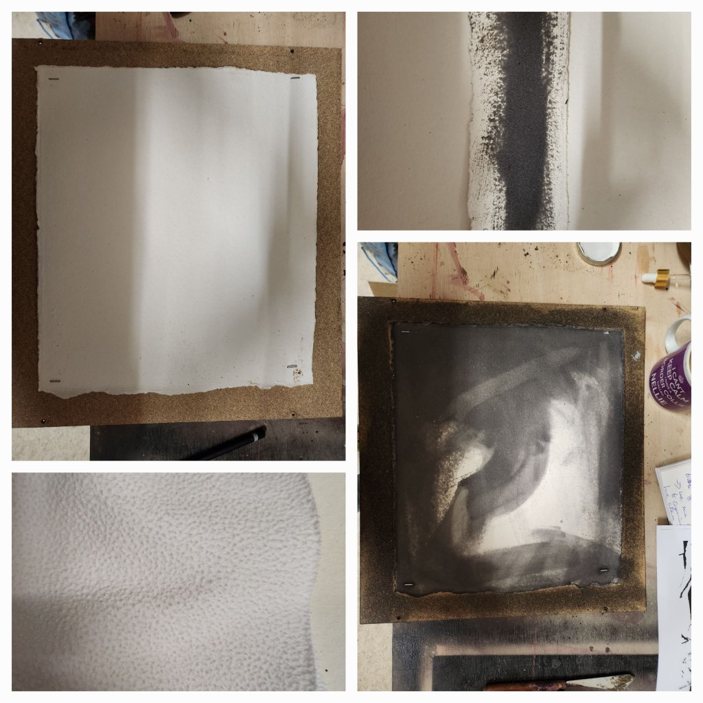 I have access to lots of used engine oil. I felt the canvas should be mix of wood and recycled paper. So I found a piece of hardboard and paired that with 640gsm Khadi Indian Rcycled Cotton Paper.