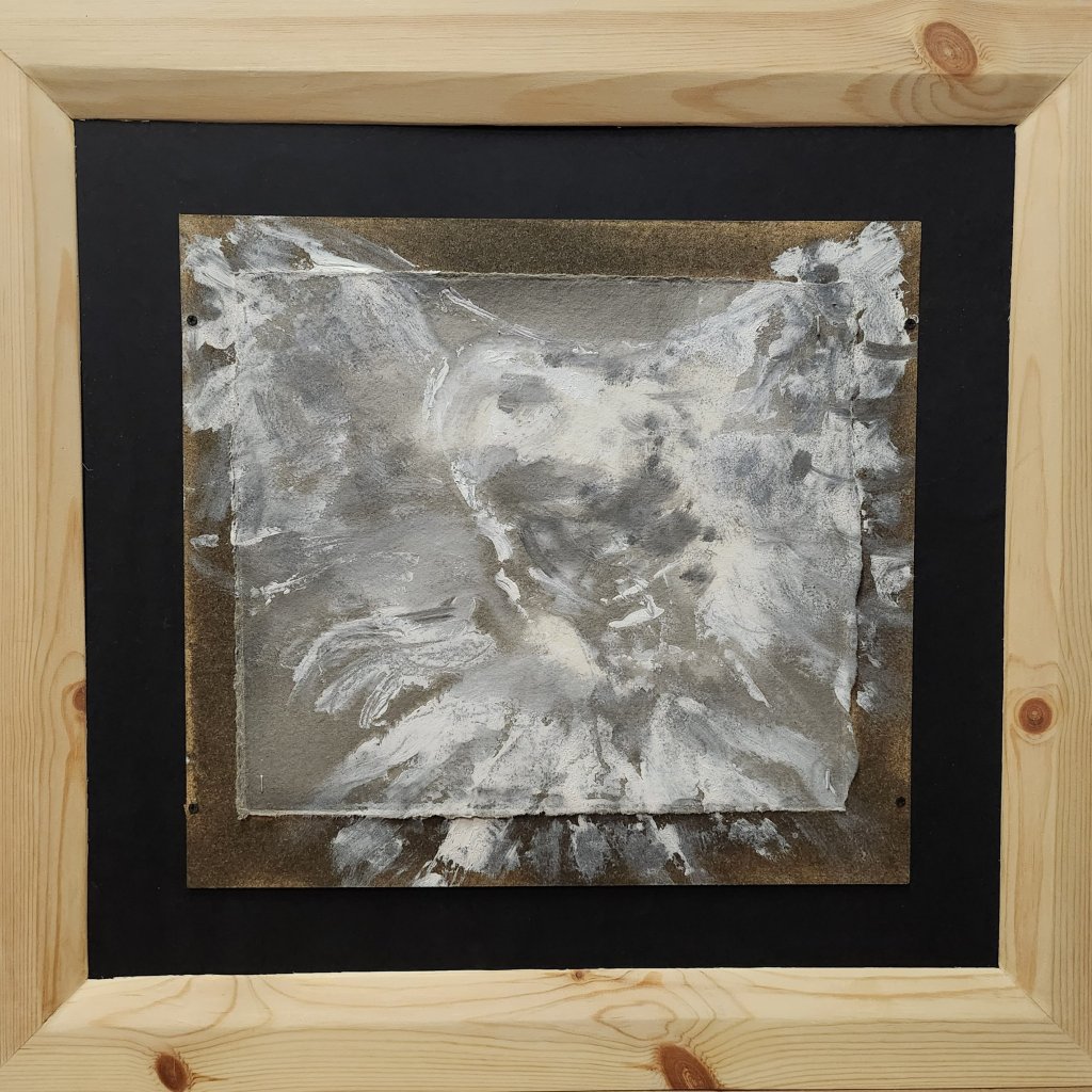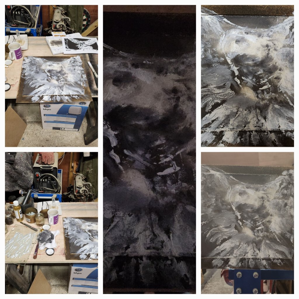 I love how it reacted with the different materials and the monotone colours that could be achieved. I then mixed up some Zinc White pigment powder and Linseed oil. I had an monotone image of a peregrine falcon that I had created in an Adobe Ilkustrator session. Using it as a guide I applied the Zinc White paint using a pallette knife and blended it into the oil.