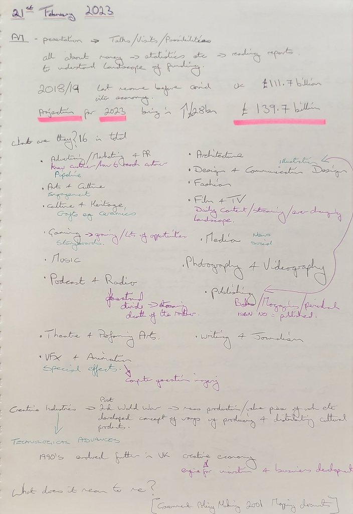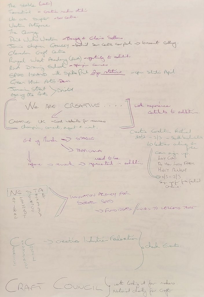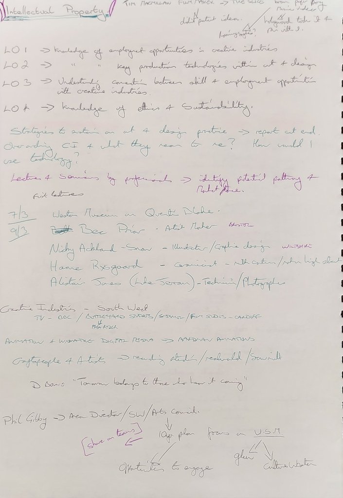 Understanding more about what actually falls under the Creative Industries umbrella and what opportunities are out there for those of us who wish to make a living out of being creative, the supporting industries, also the consideration of ethics and sustainability as a creative practitioner. This module is wordy and research based with visits from guest lecturers.