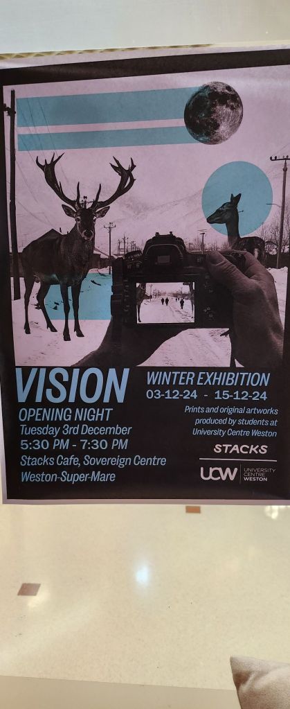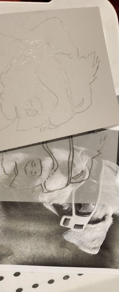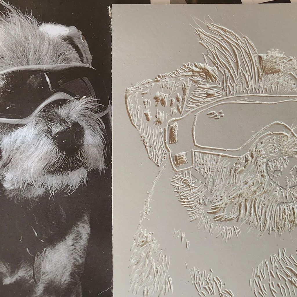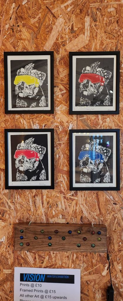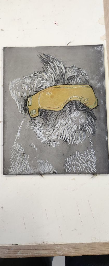 Every year the Art and Design students create work for a pop up shop. This years theme is Vision. I have really struggled to come up with something, trawling through my thousands of photographs of horses and friends at shows. I came across a photograph I had taken of my friends Border Terrier, Kauri. Kauri suffers from uveitis and has to wear special doggles to protect her eyes from sunlight. She has the most amazing pink pair and that’s how she’s ended up being my muse for Vision.