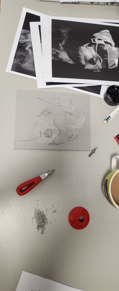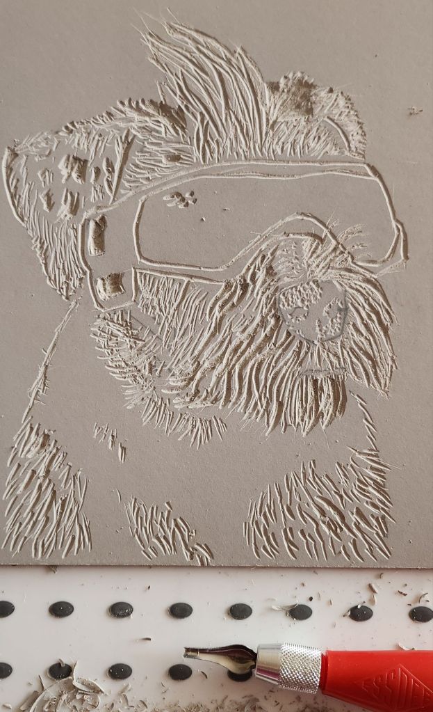I have seen videos on instagram from other linocut printers that were in different colours using the jigsaw technique. I had the idea that the doggles would be a bright colour so I cut them out as a seperate piece of lino.
