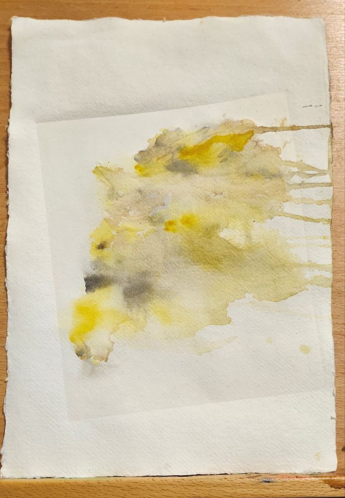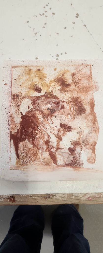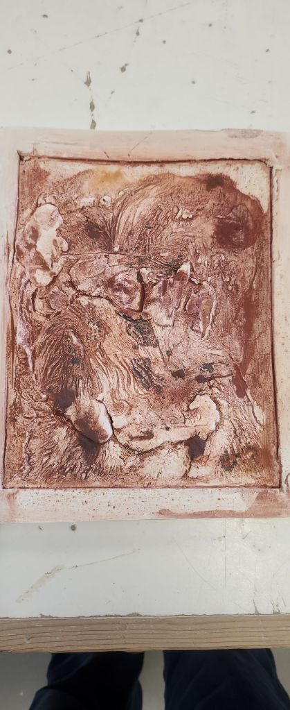 Before I started working in clay, I did another embossed paper image. This time I used more earthy colours, yellow ocher, burnt umber and raw sienna, with a little touch of black ink. I used a similar approach to how I applied oxides on my ceramic pieces last year and squirted water to direct the colour flow.