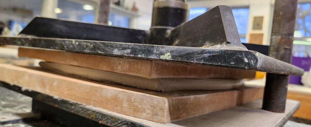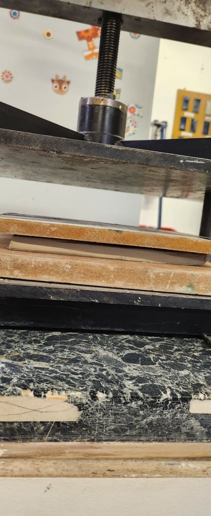Instead of using a roller and pressing hard, I used the tile press as the clay tiles were small enough to fit into the press.