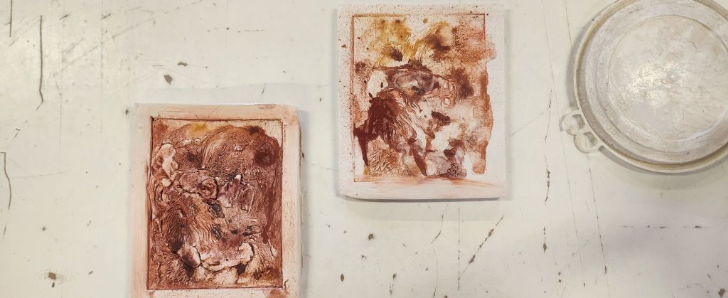 I’ve missed a post on one of the process steps, the tiles pictured below are after I had used white slip on the tiles and used oxides. The ones I use are ruttle, yellow ochre, red ochre, red iron oxide, and black iron oxide.