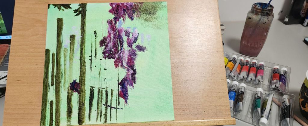 Use watercolours – I need to use them wetter so they kind of bleed into each other and I need to block more and I need to follow the fact that I have a darker pattern across the paper with the acetate’s cut and stuck so I need to make them blend into the flowers and block with more burgundy and dark green, follow the pattern lines. give the watercolour image a better composition.