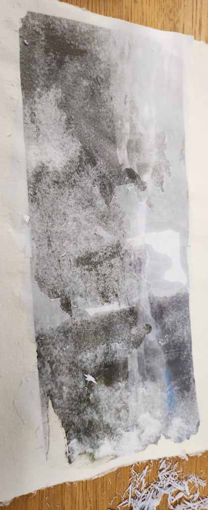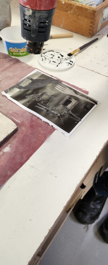 In my head, although I am being very structured, it all feels a little bitty and messy. Whilst waiting for the plaster to go off, I carried on with my idea of image transfer. Using mod podge I had a bit of plaster I didn’t paint so used that to practice the image transfer and also a piece of cotton rag handmade paper, just to see how it would work. I have done image transfer before onto MDF using emulsion so this was a familiar process to me.