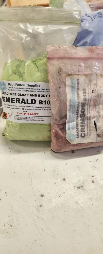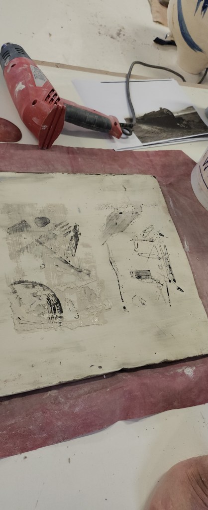 You mix up stains with water and brush it over the image then dry with a blower, then you press the image down into the wet slip on the object and smooth it over with a rubber kidney before lifting it off.I practiced with different stains, and had various results. If I got the consistency of the fresh slip on the slap wrong ie, too wet or too thick, it didn’t leave a clear image transfer.This slab needed to dry and then be bisque fired with the other slab.In the meantime, the plaster had hardened. the one that was just PVA didn’t stick. Also none of the filings had come up through the plaster, they had stuck to the PVA and I’m wondering if that had stopped the colour from seeping up through the plaster. This is probably when I feel like I’m doing a chemistry degree to understand all the reactions/non-reactions. I have an idea to try woodstains and different paints on these, but I need to come back to this. I still have more techniques to try before deciding on my final pieces.