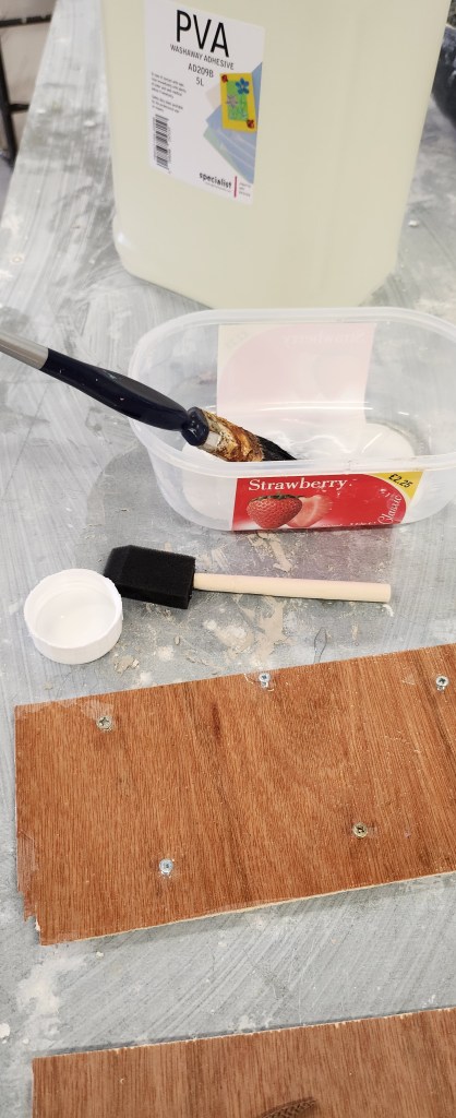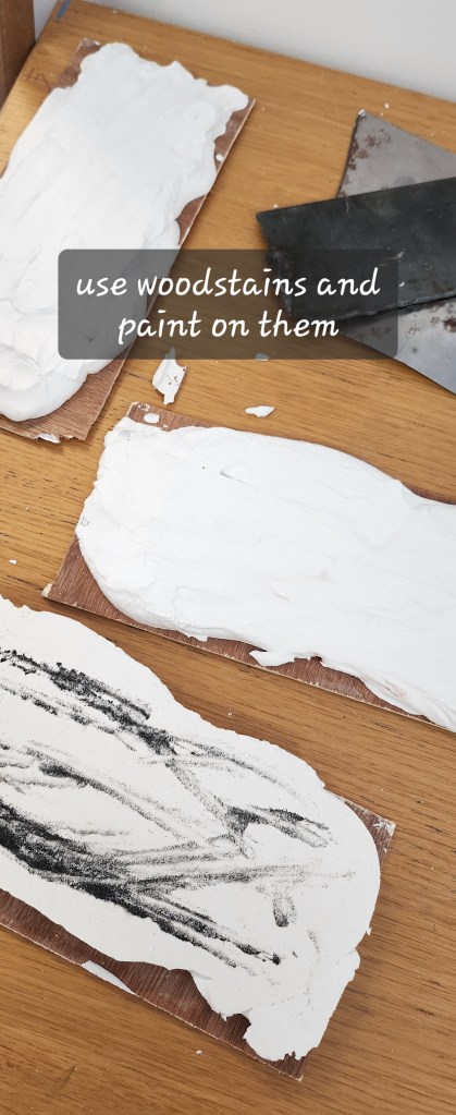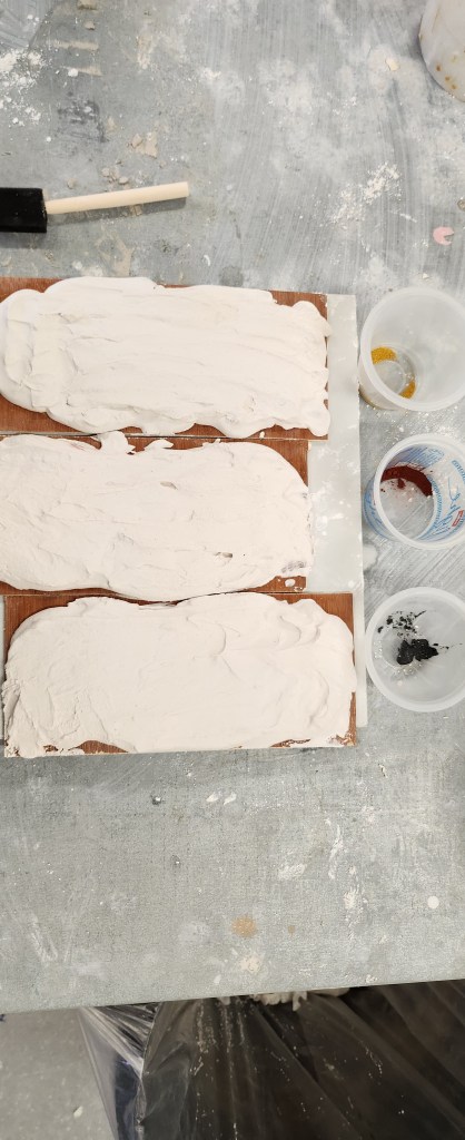 I noticed that the plaster had lifted off the wood in places, so I needed to find a way to purchase the plaster to the clay if at all possible. Its not a very environmentally friendly way of doing things as I used PVA only on one piece of wood, PVA and screws slightly raised in another piece of wood, and PVA smaller pieces of wood on the third. Also I was interested to see if the oxidisation effect of the rust coming up through the plaster would work with other materials so I used yellow ochre, iron oxide pigment and zinc filings.