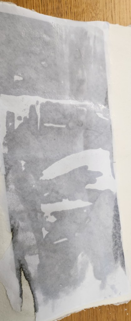 I then gradually dampened the top image and started to remove the backing from the paper. It worked reasonably well. I didn’t get brilliant results on the paper, but it worked well with the plaster. Had a ghostly effect.