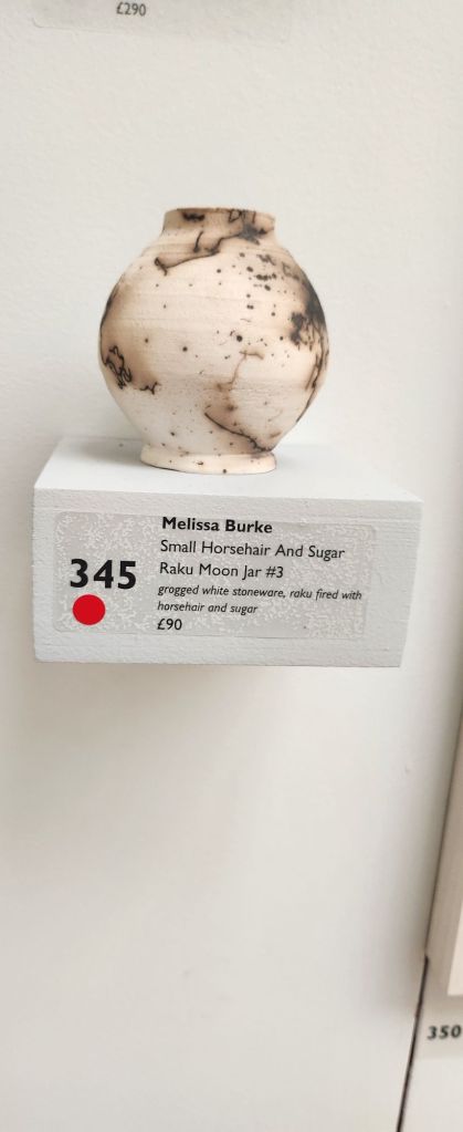 Another piece that caught my attention, tucked away in another room  at the RWA was this little raku fired pot.  It gave of this air of fragility and I particularly like the way the horse hair and sugar blended with the clay and made their own marks during the firing process.