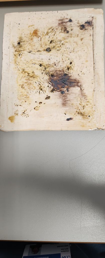 The oxides still need to be applied more thickly as they are burning off in the firing process. The tile that had the glaze wiped off has more colour, unfortunately some areas had no glaze at all. Next time I need to be more careful about how much I wipe off.