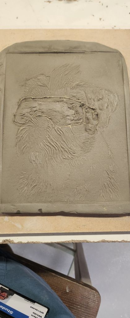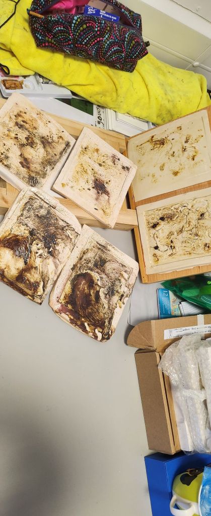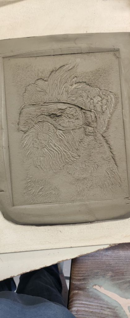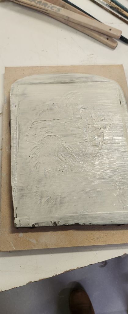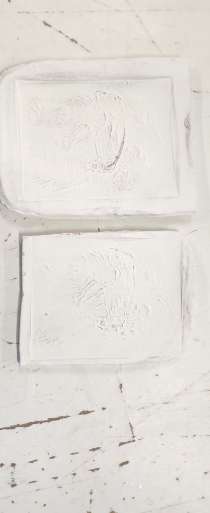 For these two tiles I have decided to wipe off half on each to see how they turnout after the final firing. I also added Manganese Oxide to the ones used to add a different shadow tone.