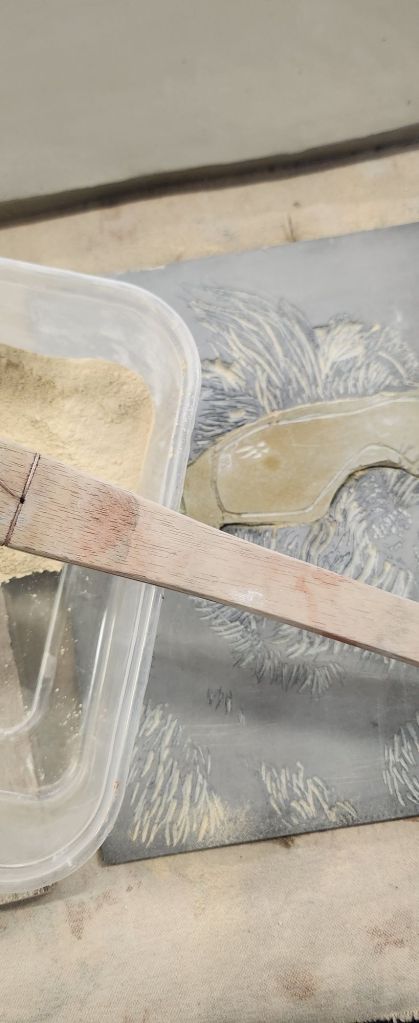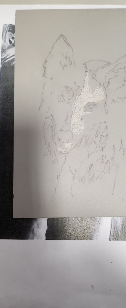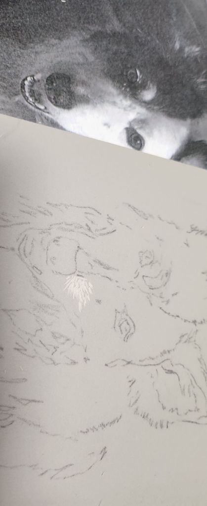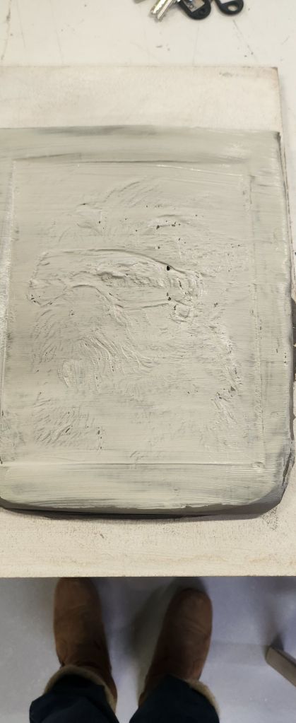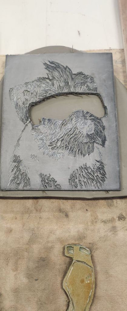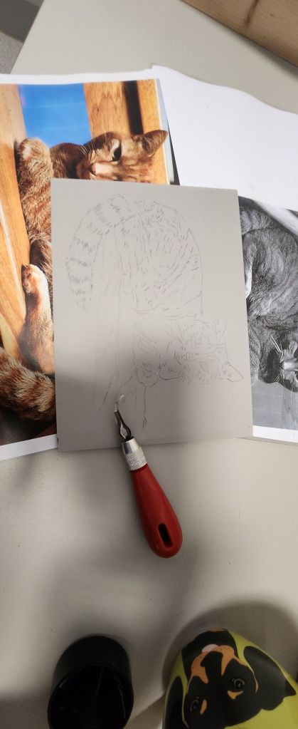 The hardest part when flipping and tracing the images for lino’s is remembering which way round the original image is so that you can cut out the correct area and use the negative spaces to create the print. This photo of my dog, I flipped the image when transferring to the lino. Her half white face will be on the opposite side when finally printed. However, as I was cutting into the lino I was close to doing it on the left side – I had to keep reminding myself it was flipped.