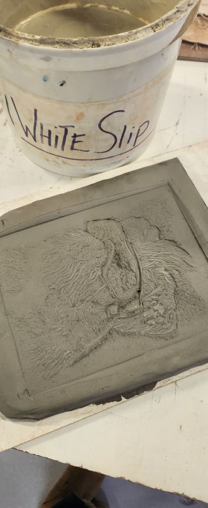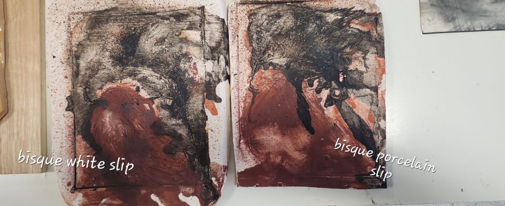 Last year I used a mix of both slips on the bottom piece, just in the centre and applied the oxides more heavily.