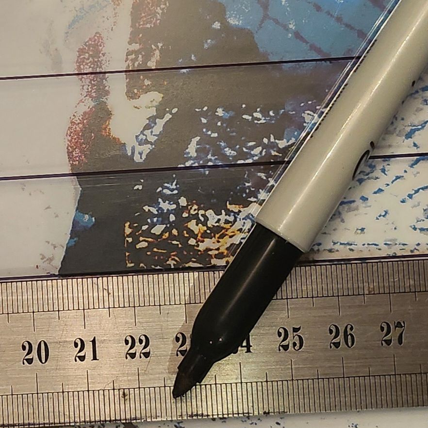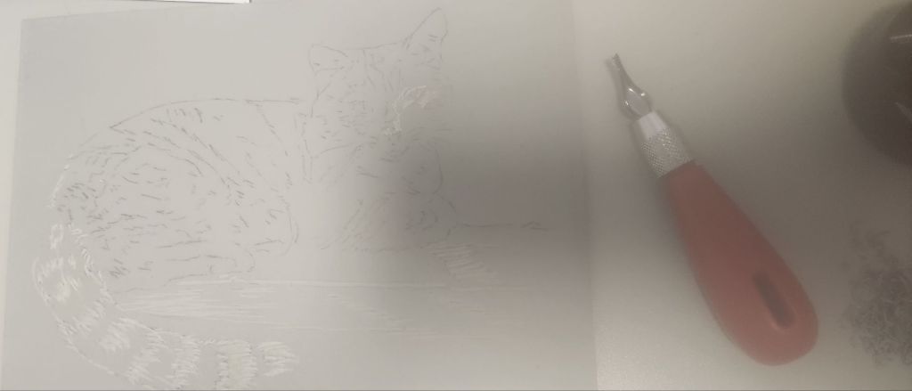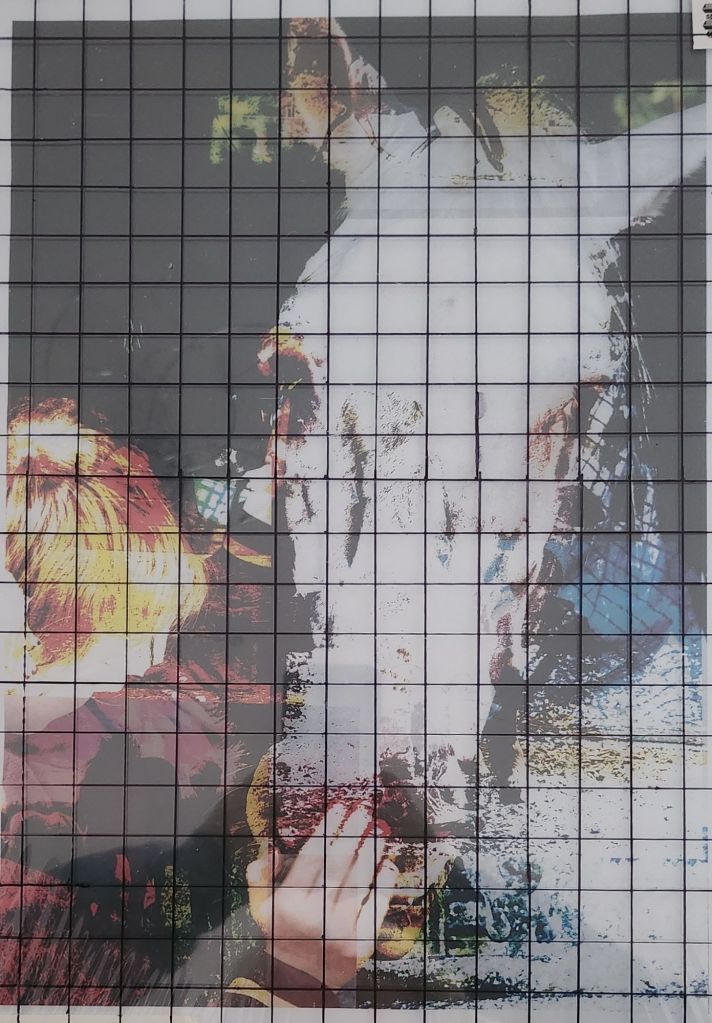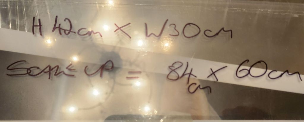 I had found a piece of hardboard that needed to be prepared for painting and worked the size of the printed image and calculated the scale needed to fit the wood. I had ordered a large glass table kitchen worktop protector for my hand printing at home as an easy clean surface. I drew my grid on the cellophane/thin plastic it was wrapped in and taped the picture to the back.