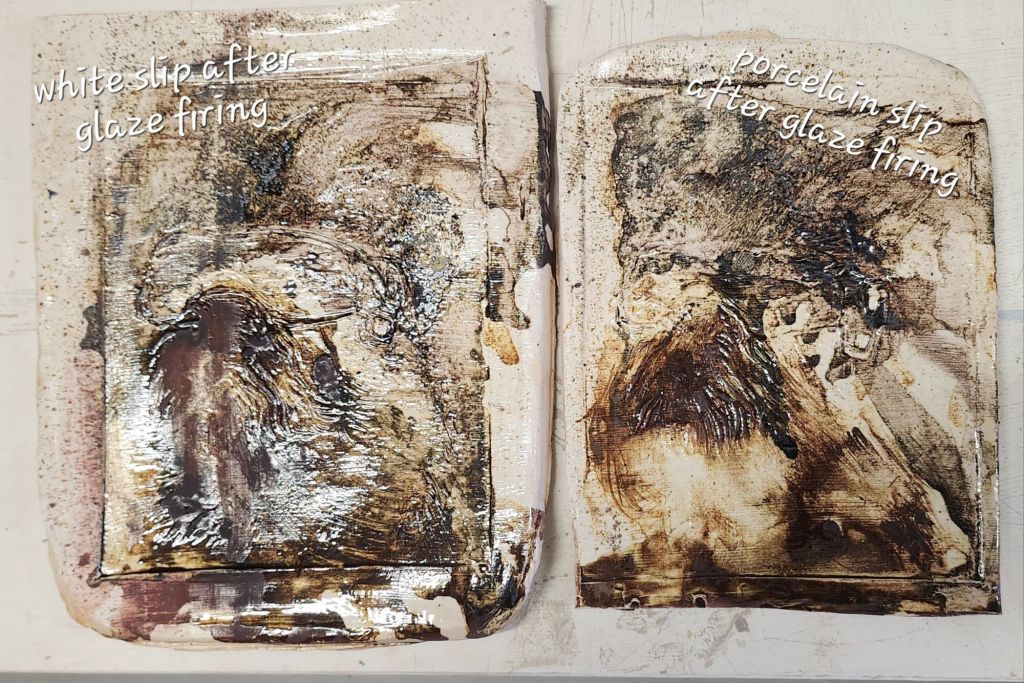 The last pair of ceramic tiles have been glaze fired and I like them both for different reasons. I had applied the oxides more heavily, diluted the glaze and then wiped half. I think both slips have merit in how the oxides react. I will definitely do a mix of the two to create more tones in the images I create. I had accidentally wiped of the oxides with glaze on the porcelain slip, however I like the tonal range in the red iron oxide and black iron oxide mix around the nose.