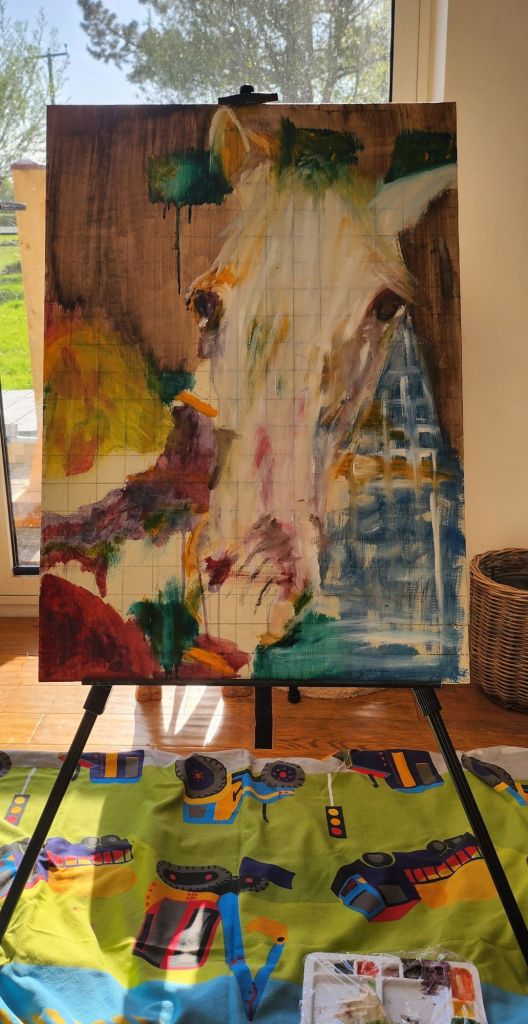 The messy phase – it can feel quite despondent and as if you are just making it all worse as you add the base layers and background colours. I’m not happy with the eyes and I’m trying to concentrate on doing other areas rather than keep going back and making them worse. The problem is trying to get the head tilt perpective when one side of the face is more abstract.